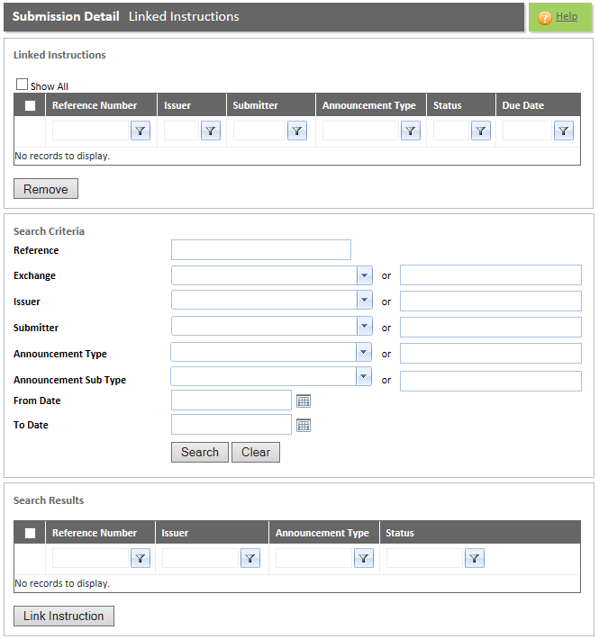 You will need to search for the announcements that you wish to link to the current announcement. Enter or select the relevant search criteria in the "Search Criteria section". You can either click the <down-arrow> button the right of each field in order to select an option or you can manually enter the search criteria in the field to the right. |